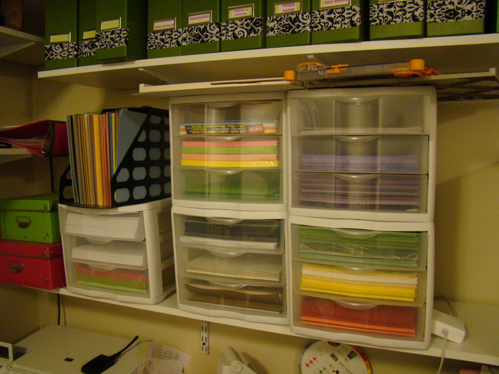 Hello crafters. I have been away much too long. I have been so busy cleaning, cleaning and yes cleaning! It never ends! I took a break and cleaned some more, :-) but this time it was for me! I hated my 8 1/2 x 11 paper storage area which was right above my desk. I just never liked what it looked like, and it wasn't very efficient. I couldn't see what type of paper I had, because they were inside the drawers. The drawers were constantly falling down, into the drawers below because the papers were too heavy. I decided to get some more Jetmax Drawers from Michaels.